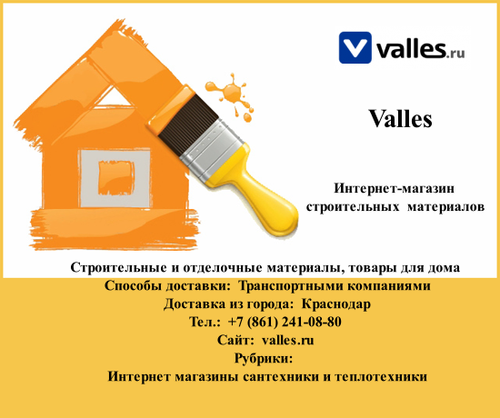 Группа товаров/услуг: Строительные и отделочные материалы, товары для дома Способы доставки: Транспортными компаниями Доставка из города: Краснодар Тел.: +7 (861) 241-08-80 Сайт: valles.ru Рубрики: Интернет магазины сантехники и теплотехники Интернет магазины товаров для строительства и ремонта